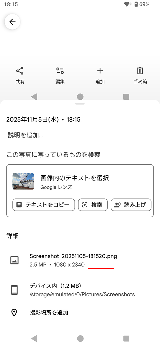 すると、スクリーンショットの画像からは、Ultra HDR という表示がなくなってしまった。