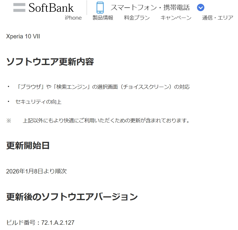 ソニーおよびソフトバンクが販売されている「Xperia 10 VII」について、最新のアップデートが2026年1月8日に配信。