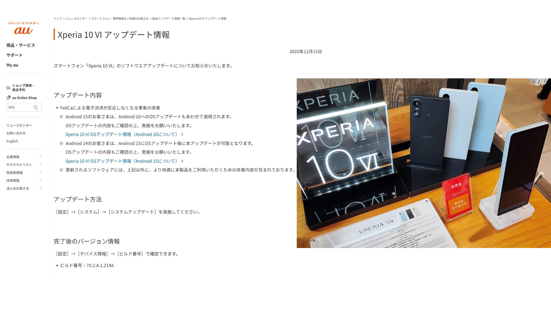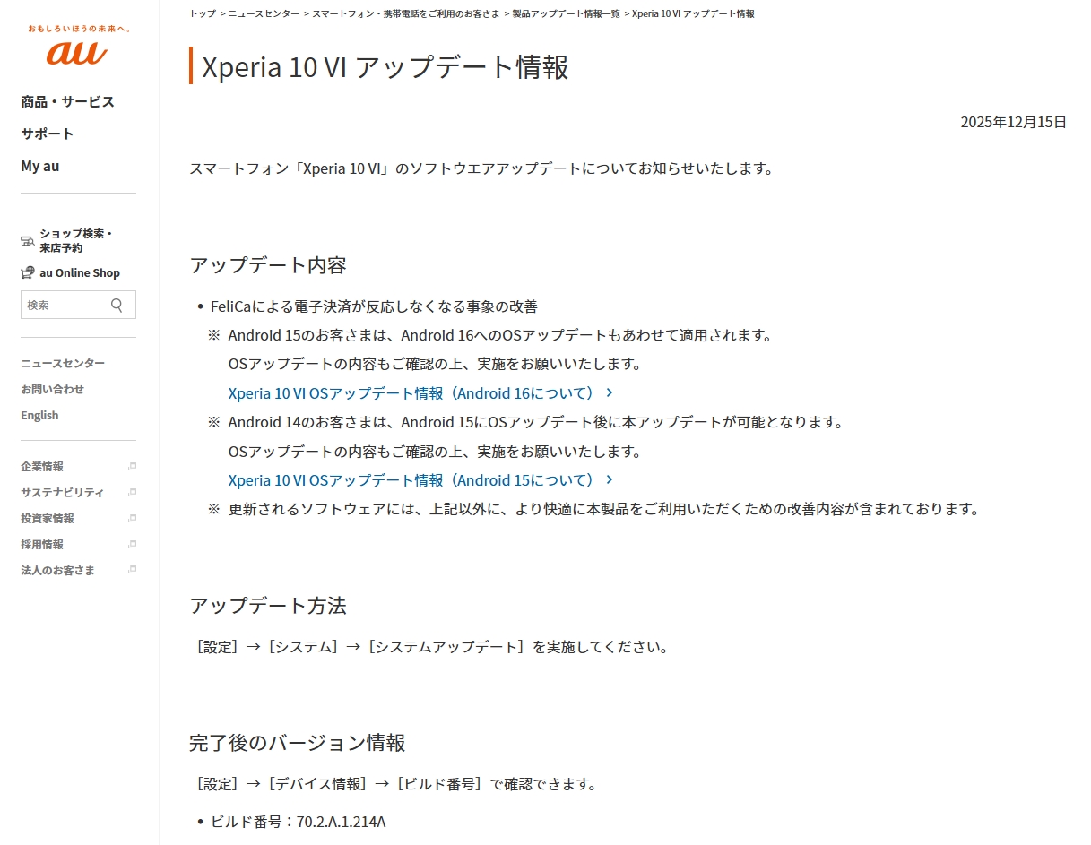 auが販売しているXperia 10 VIについて、NTTドコモに続いて2025年12月15日よりFeliCaによる電子決済が反応しなくなる事象が改善される本体ソフトウェアアップデートを配信開始。