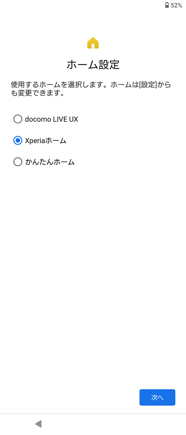 ホーム設定について、「docomo LIVE UX」、「Xperiaホーム」、「かんたんホーム」から選択。