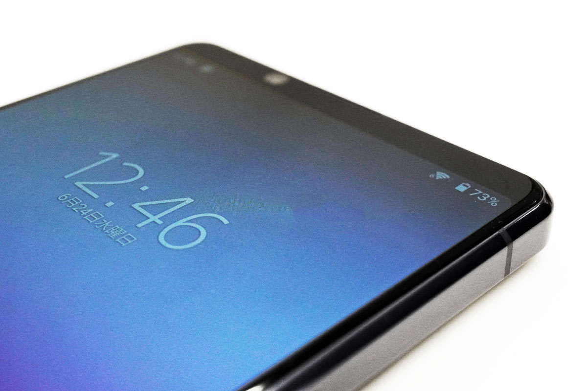 ディスプレイの表示範囲に保護フィルムのラインが重なることもなく、フロントカメラとセンサーの切り欠きも部分をみてもほぼ同化していて継ぎ目がわからないほど。