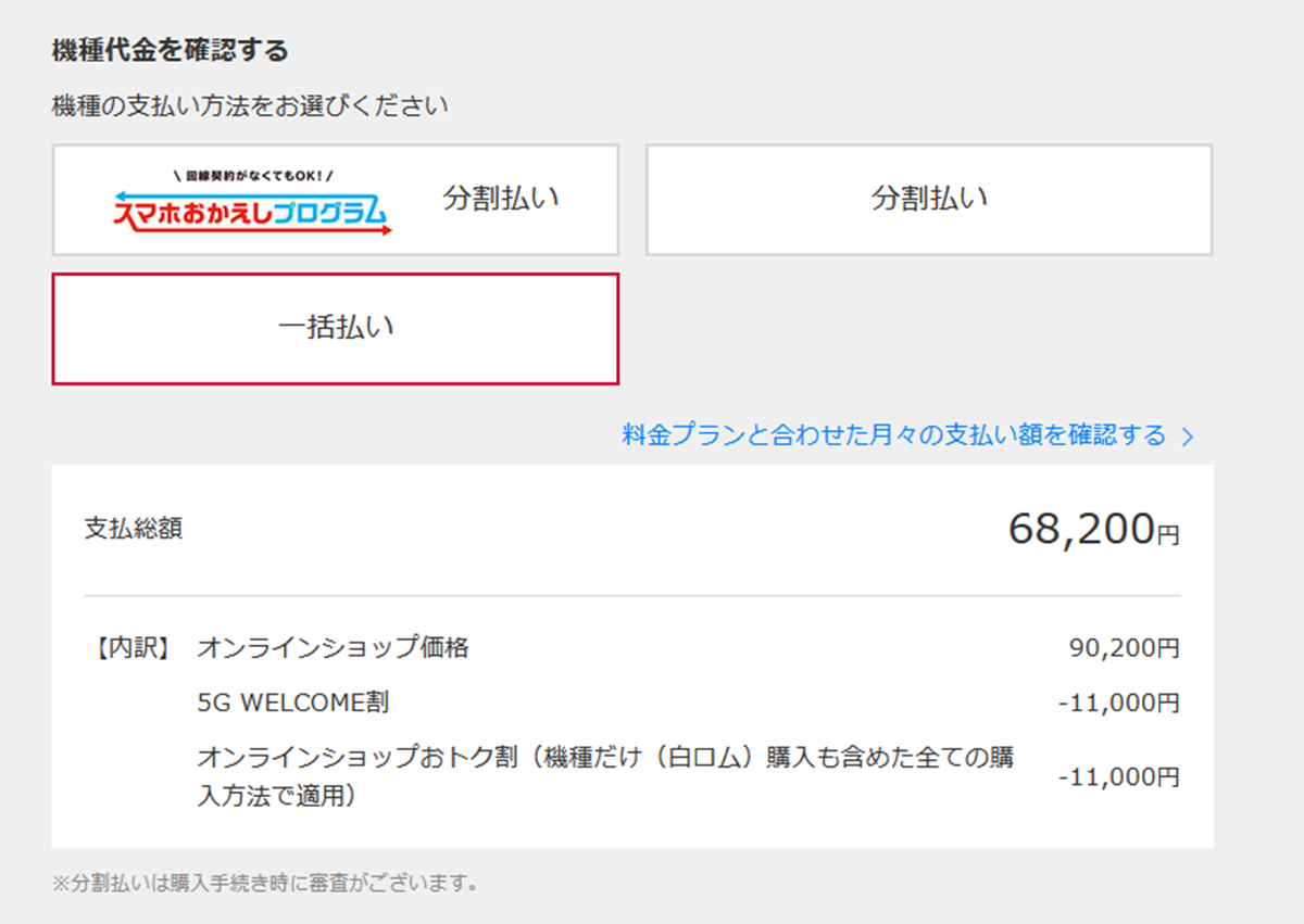 注意点としては、「端末のみ購入」の場合、適用されるのは「オンラインショップおトク割:11,000円割引」のみで79,200円。