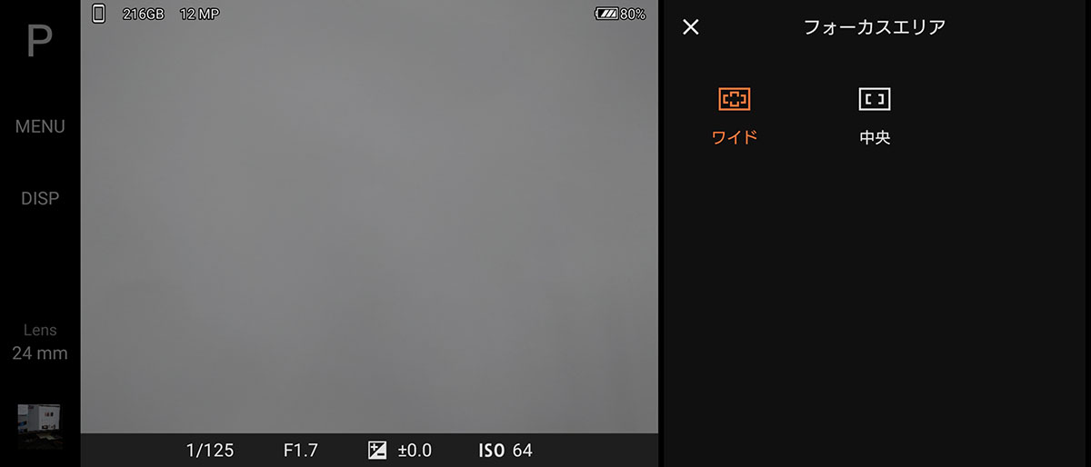 左にあるレンズアイコン(焦点距離のあるアイコン)をタップすると、超広角(16mm)、標準(24mm)、望遠(70mm)から選べる。