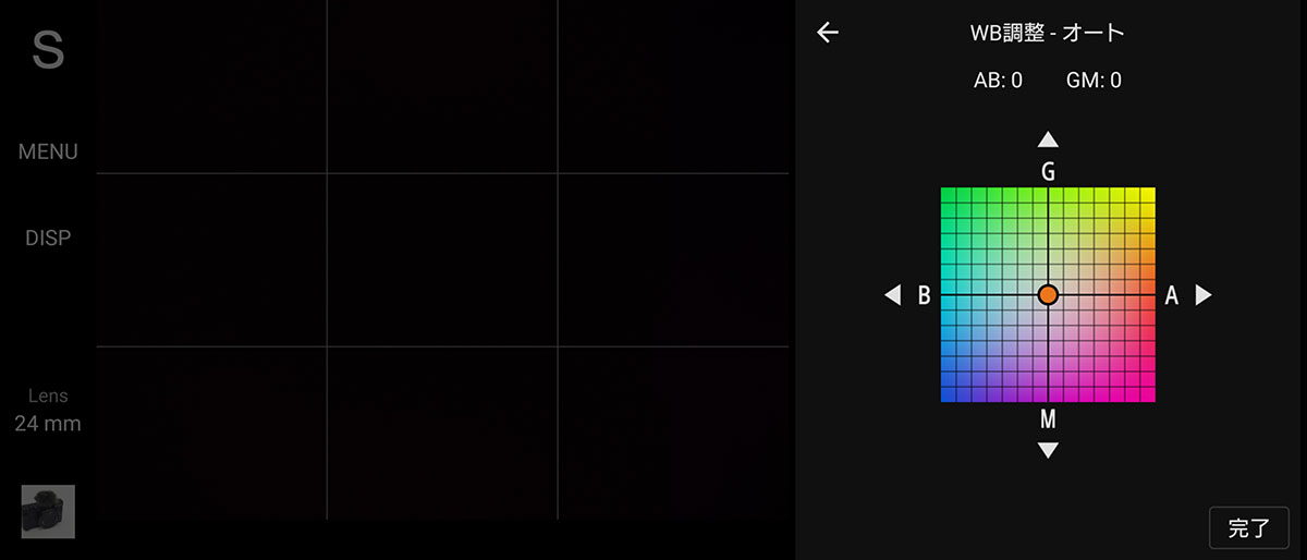 一つホワイトバランス設定を選んだのちに「調整」をタップすると、色合い(ABGM)設定画面がでてくるので、オレンジのポイントを移動させて色合いを調整したのちに撮影すればOK。