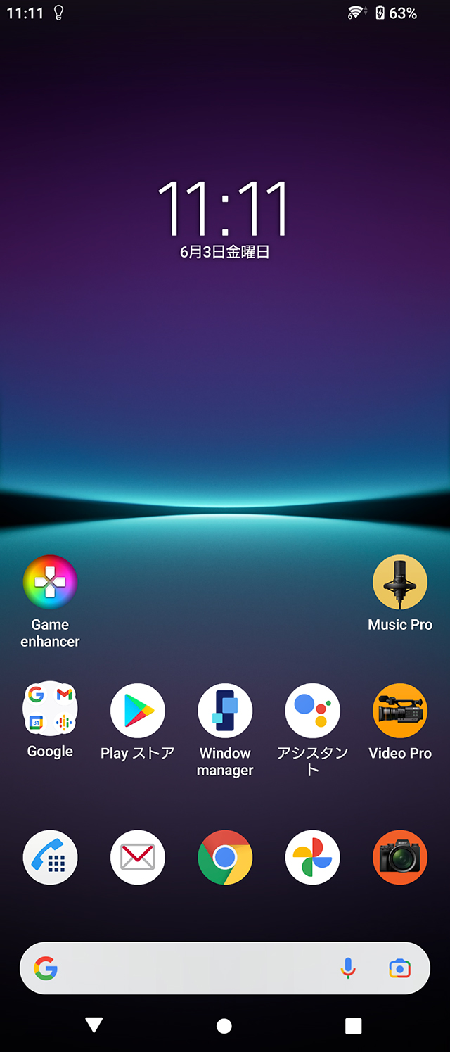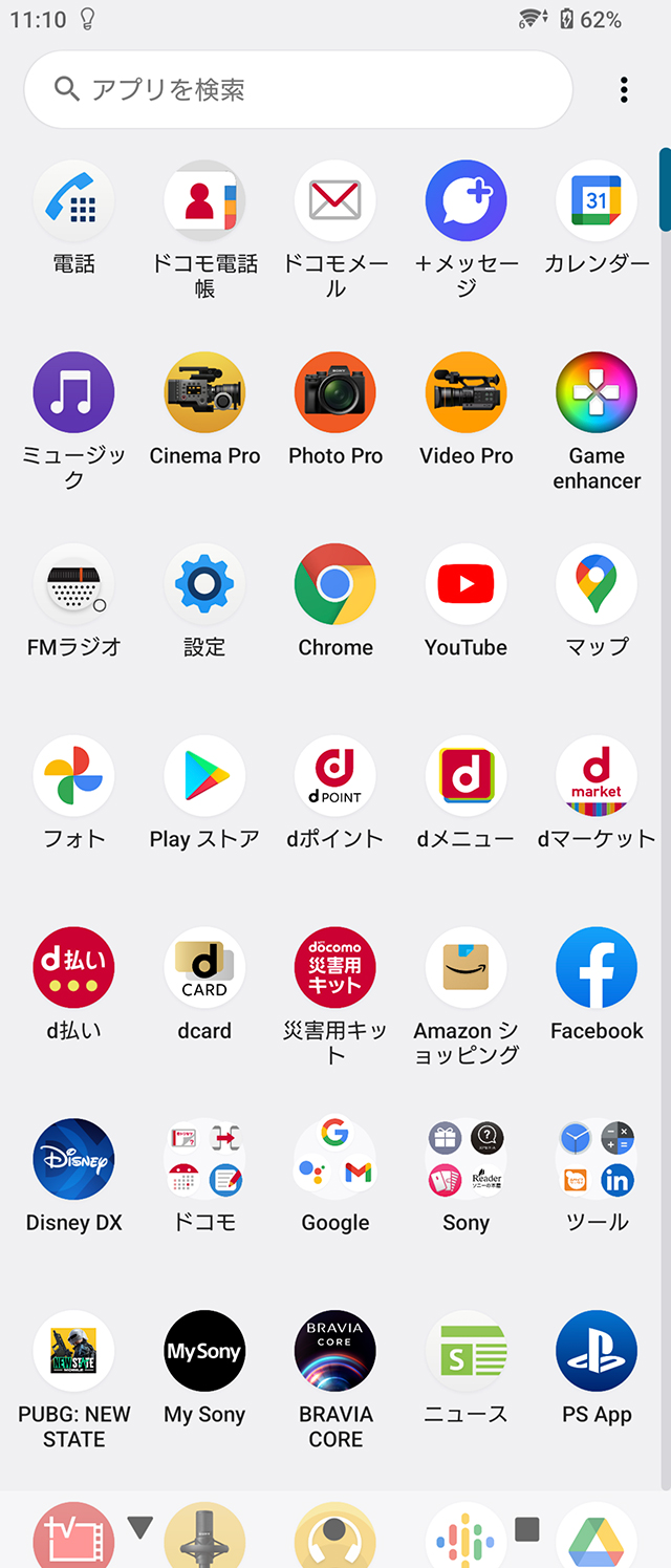 ソニー謹製アプリとして入っているのは、「Photography Pro Pro」、「Videography Pro」、「Cinema Pro」、「Game enhancer」、「ミュージック」、「BRAVIA CORE」、「Window manager」、「Xperia Lounge Japan」、「Xperiaガイド」、「Xperiaカバー」、「Reader by Sony」