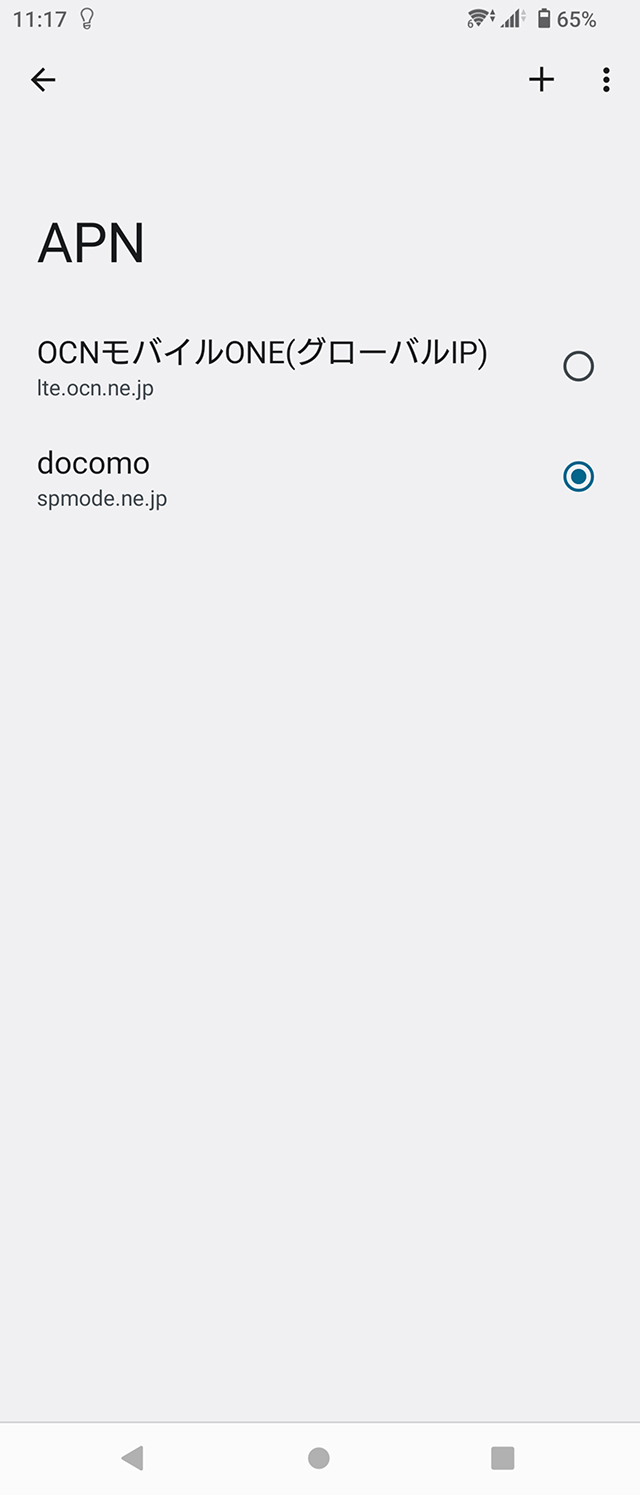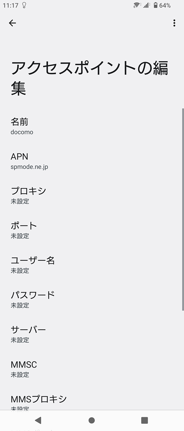 「設定」アイコンから「ネットワークとインターネット」>「モバイルネットワーク」>「アクセスポイント名」をタップして開くと「docomo(spmode.ne.jp)」が選ばれているはず。