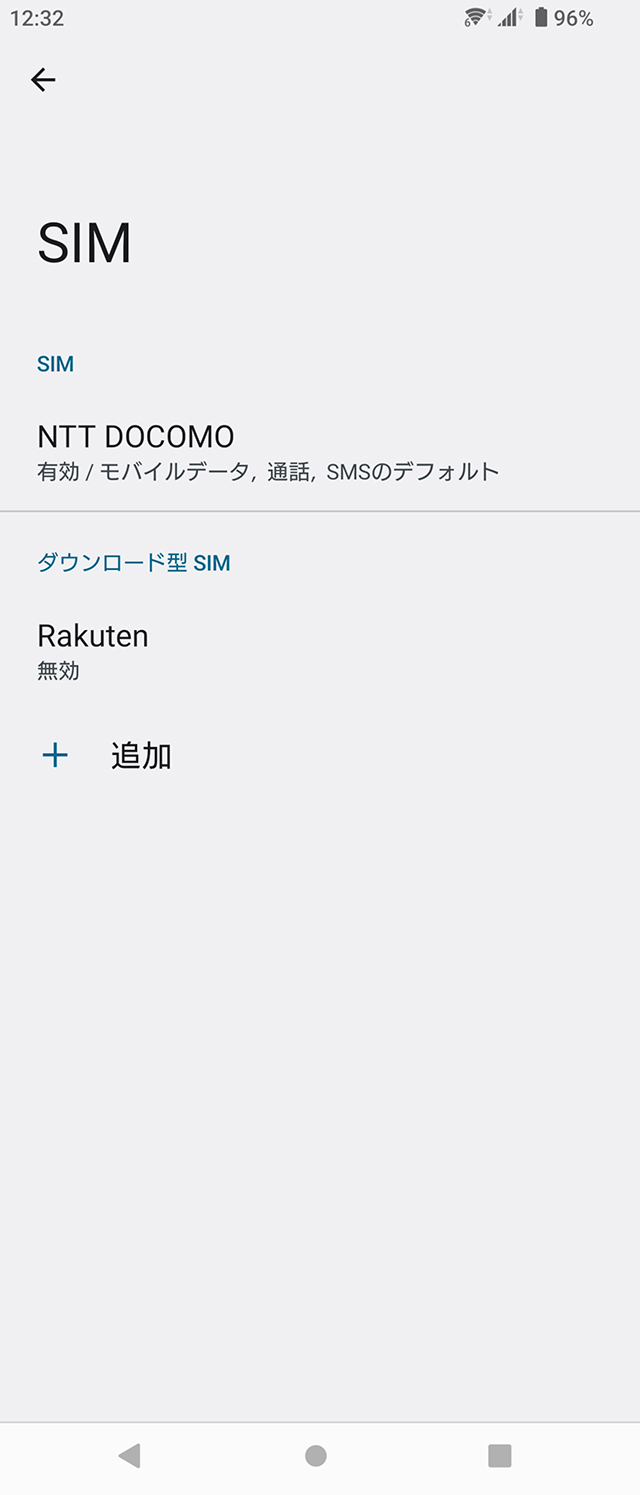 「ネットワークとインターネット」を確認すると、[通話とSMS]、[SIM]の項目それぞれに、NTT DOCOMO(物理SIMカード)とRakuten(eSIM)の名称が表示さているのがわかる。
