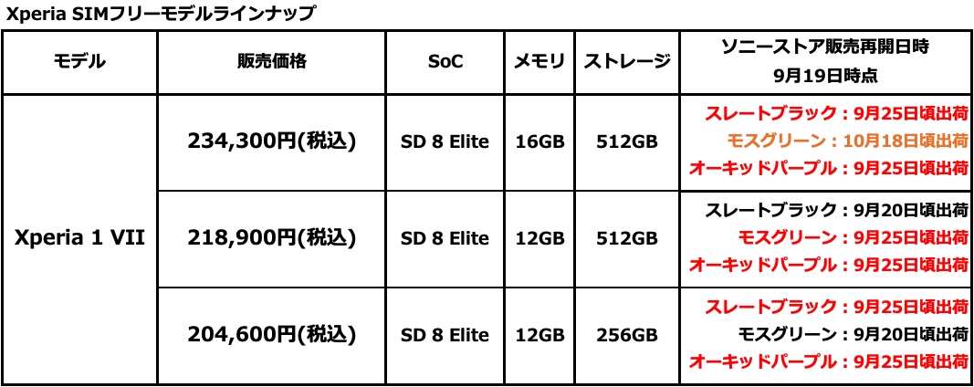 9月19日時点のXperia 1 VII(XQ-FS44)販売状況は、以上の通り。