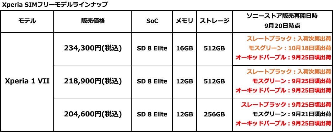 ソニーストアで販売再開されたXperia 1 VII(XQ-FS44)について、納期情報が更新。