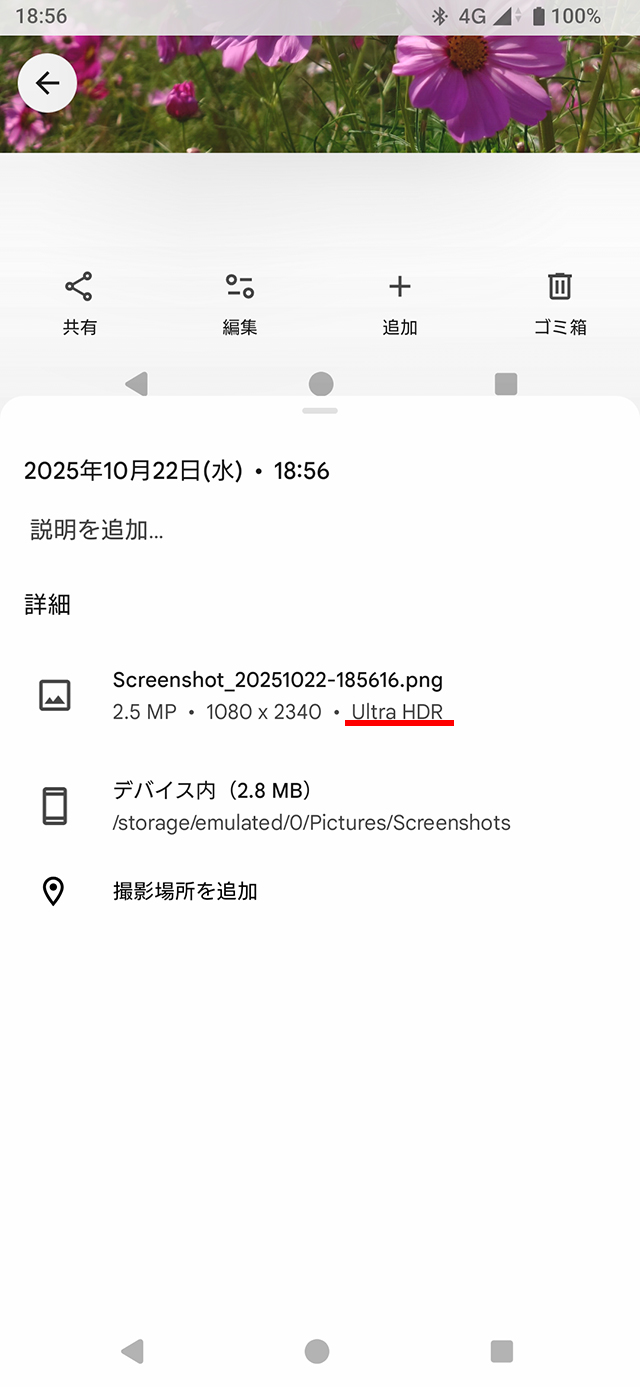 カメラアプリからUltra HDRで撮影した画像をスクリーンショットすると、そのスクショ画像もUltra HDRとして保存されていることが確認できる。