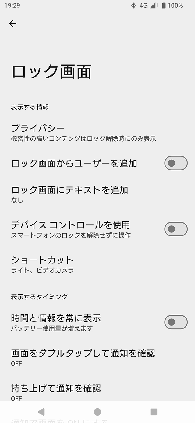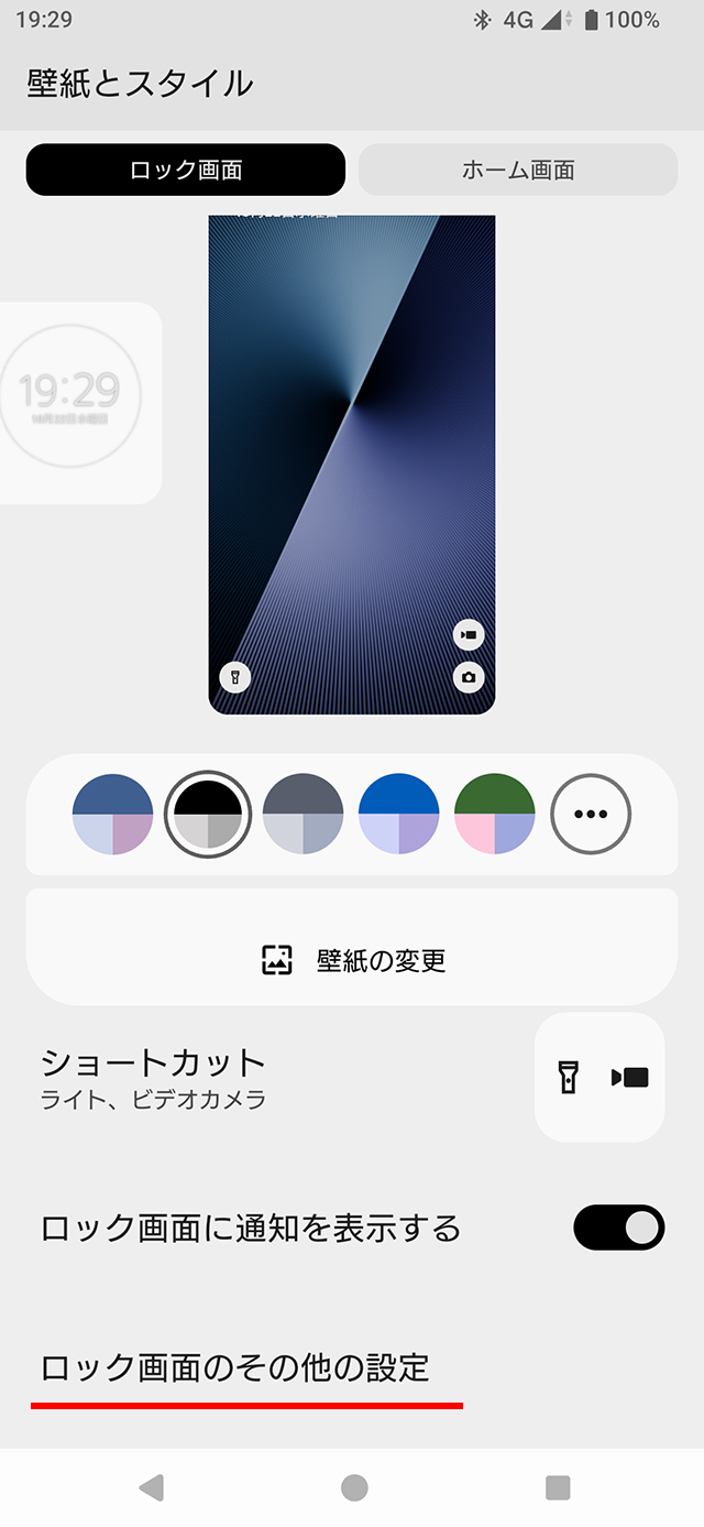 ホーム画面の何も表示されていないところを長押しして、[壁紙とスタイル] > [ロック画面] > [ロック画面のその他の設定]をタップする。