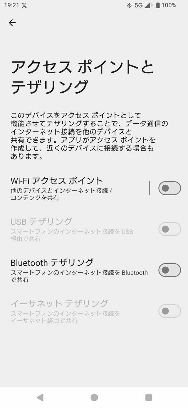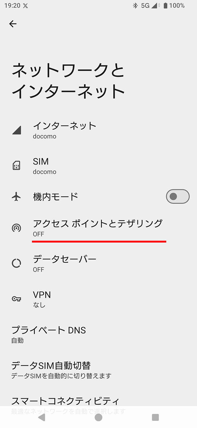 Wi-Fiアクセスポイント機能を使う場合、[設定] > [ネットワークとインターネット] > [アクセス ポイントとテザリング]をタップする。