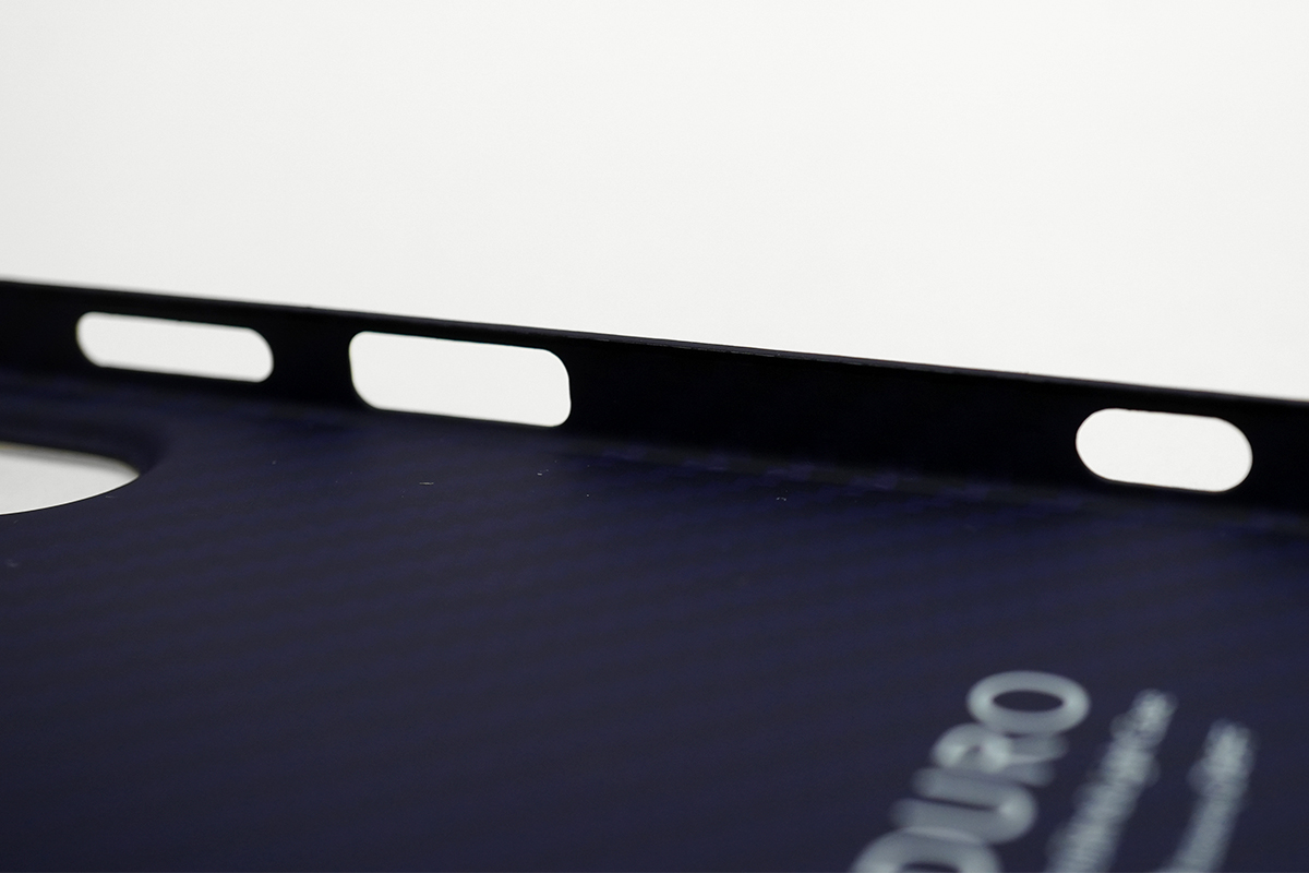 加工が難しいアラミド繊維のため、本体上下に若干の切り欠きはあるものの最小限にとどまっている。