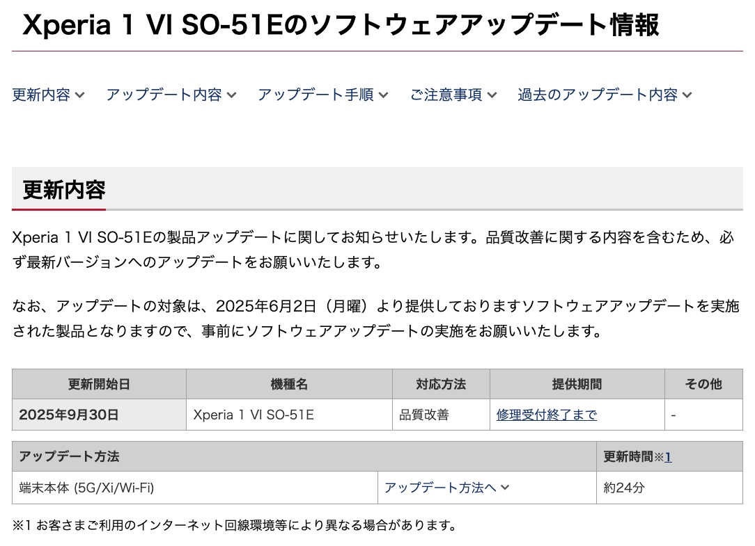 Xperia 1 VI SO-51E(NTTドコモ株式会社)アップデート内容