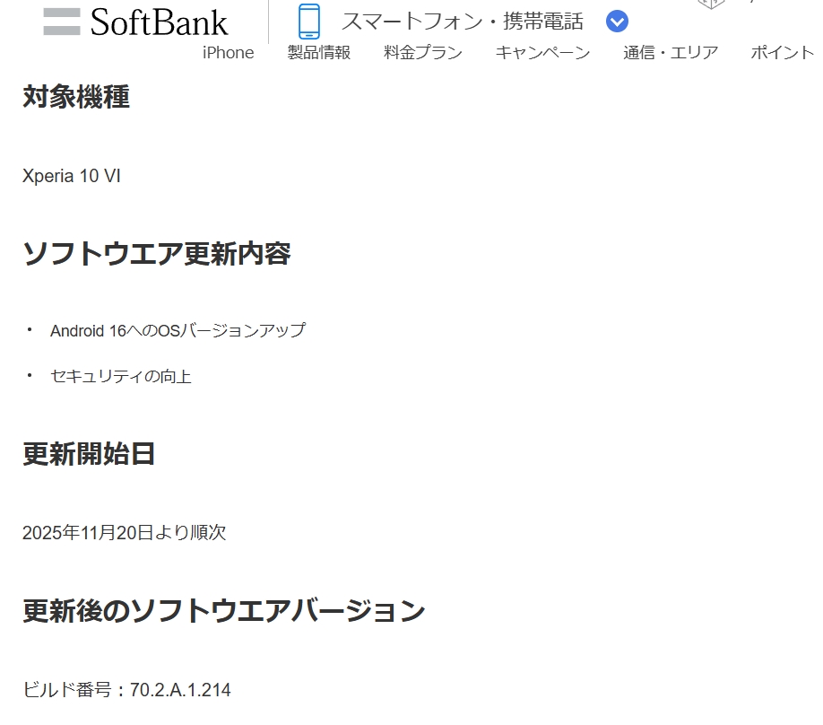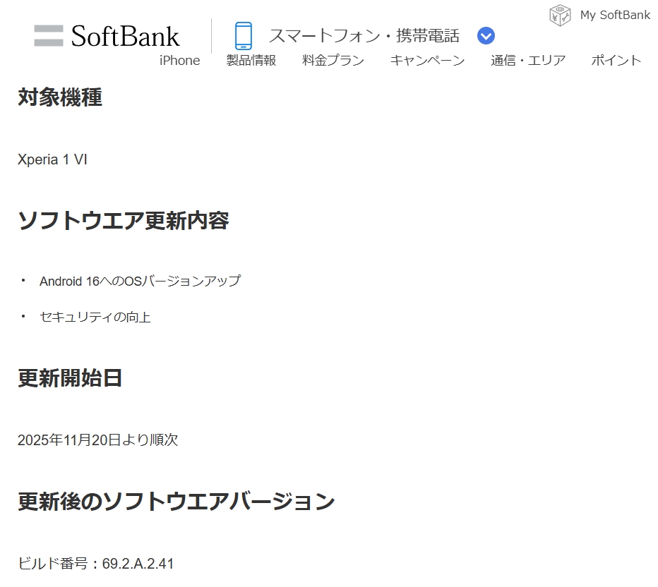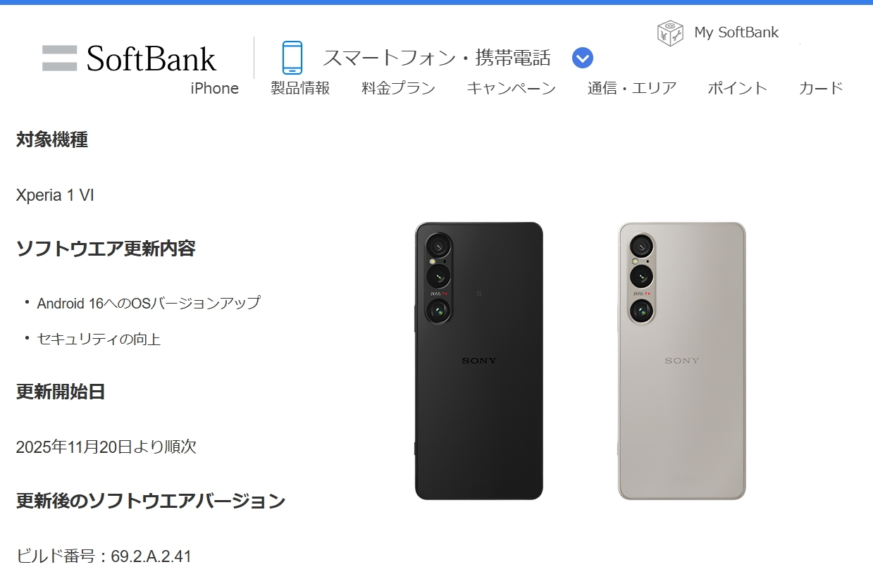 ソフトバンク Xperia 1 VI / Xperia 10 VI に、Android 16 OSバージョンアップ配信開始。(2025年11月20日)