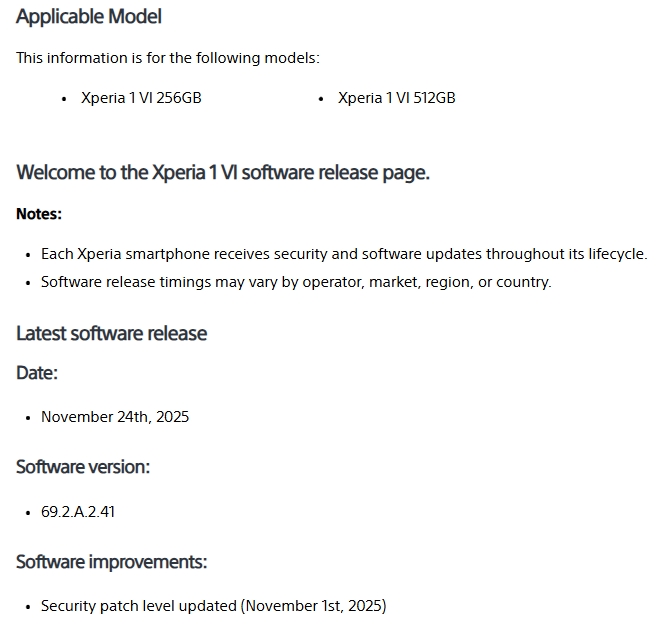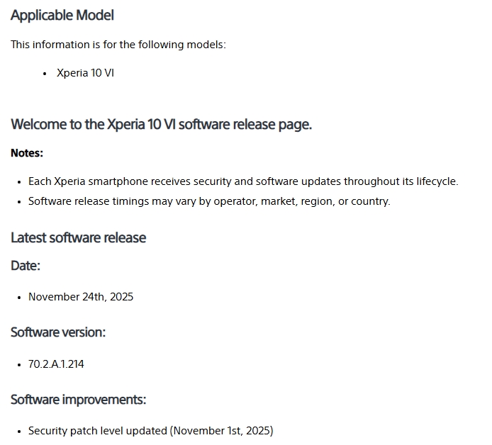 Xperia 1 VIと同様に、同じビルド番号 70.2.A.1.214 では、セキュリティパッチレベルが2025年11月分となっている。