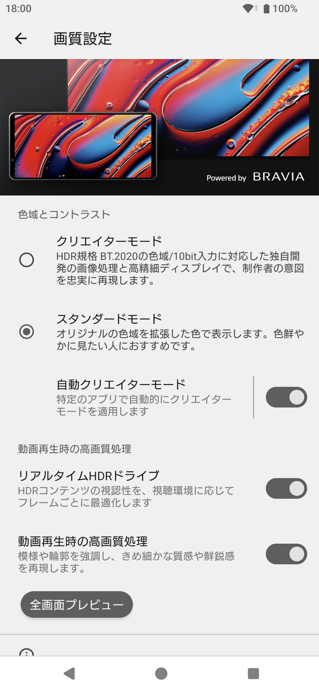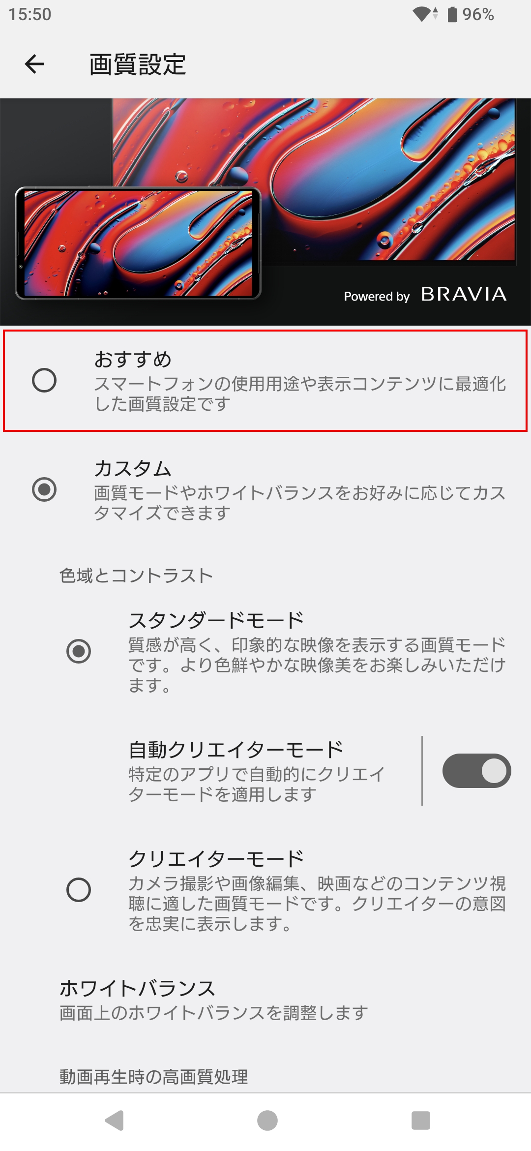 [設定] > [ディスプレイ] > [画質設定] > [おすすめ]
