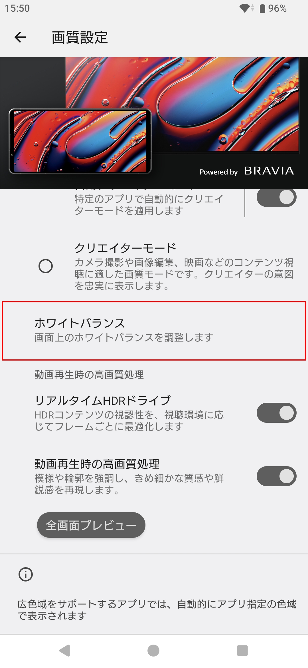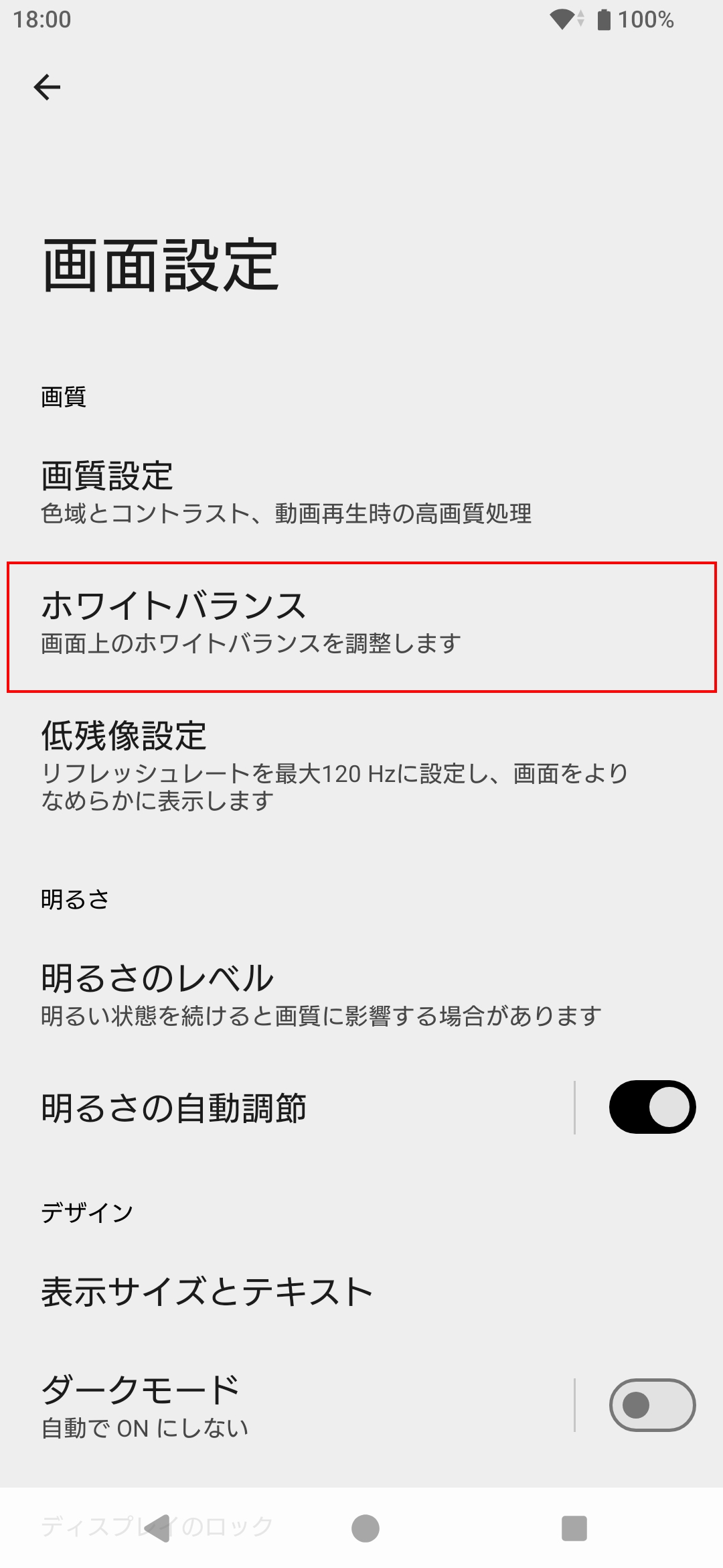 [設定] > [ディスプレイ] > [画質設定] > [ホワイトバランス]