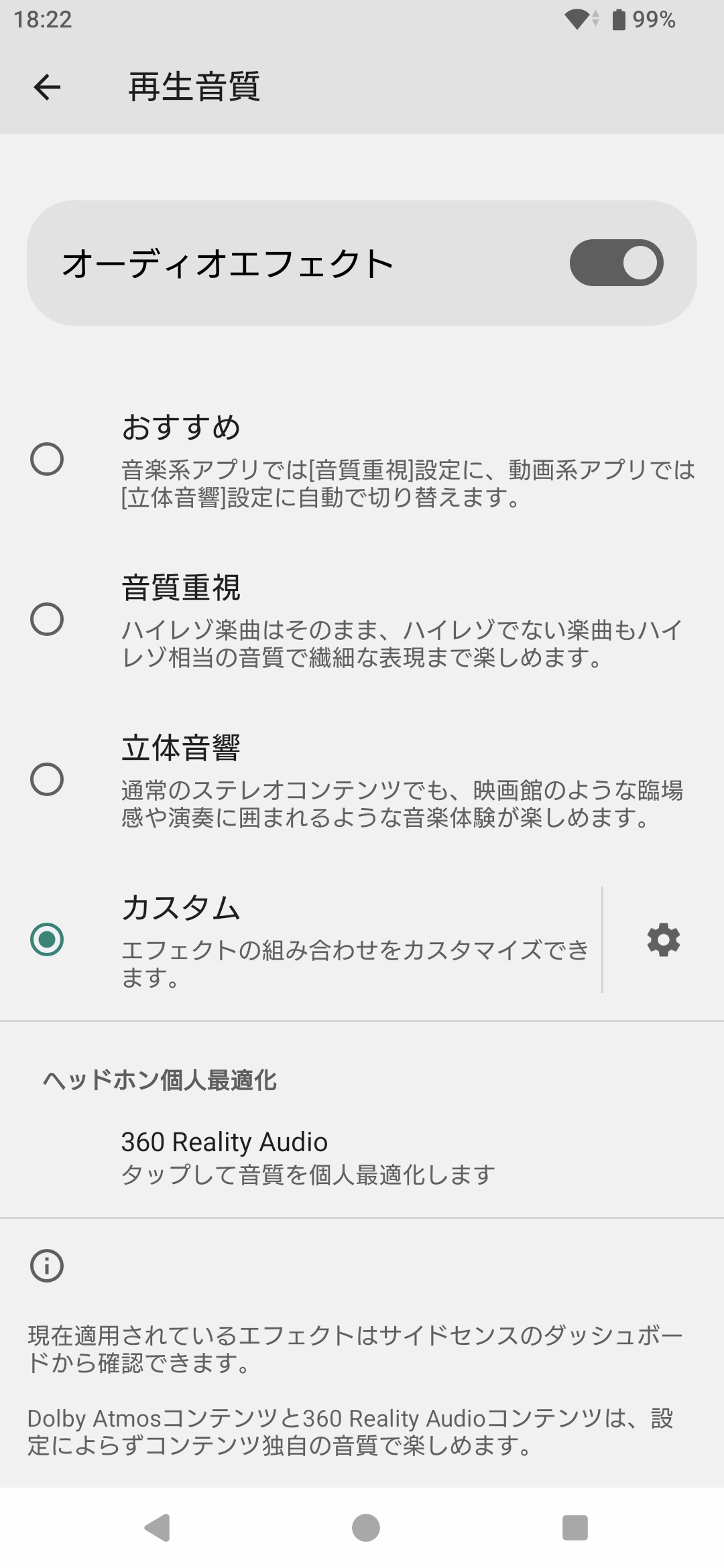 Xperia 1 VIでは、これまでDolby Sound、360 Upmix、DSEE Ultimateの設定は可能ではあるものの、音楽アプリと動画・その他アプリのエフェクトが共通化されていた。