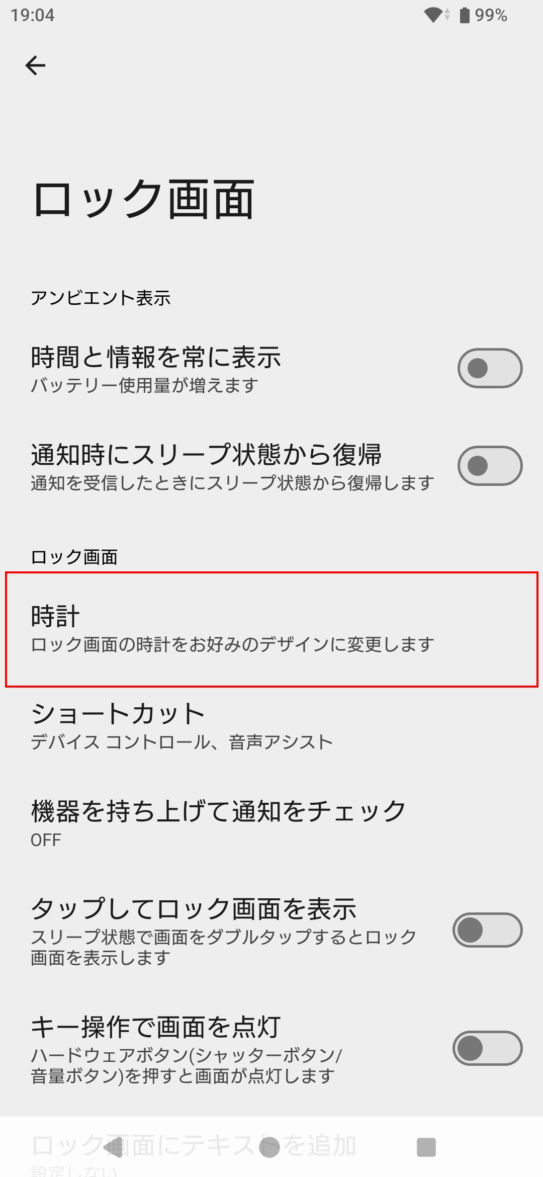 [設定] > [画面設定] > [ロック画面] > [時計]の項目が削除