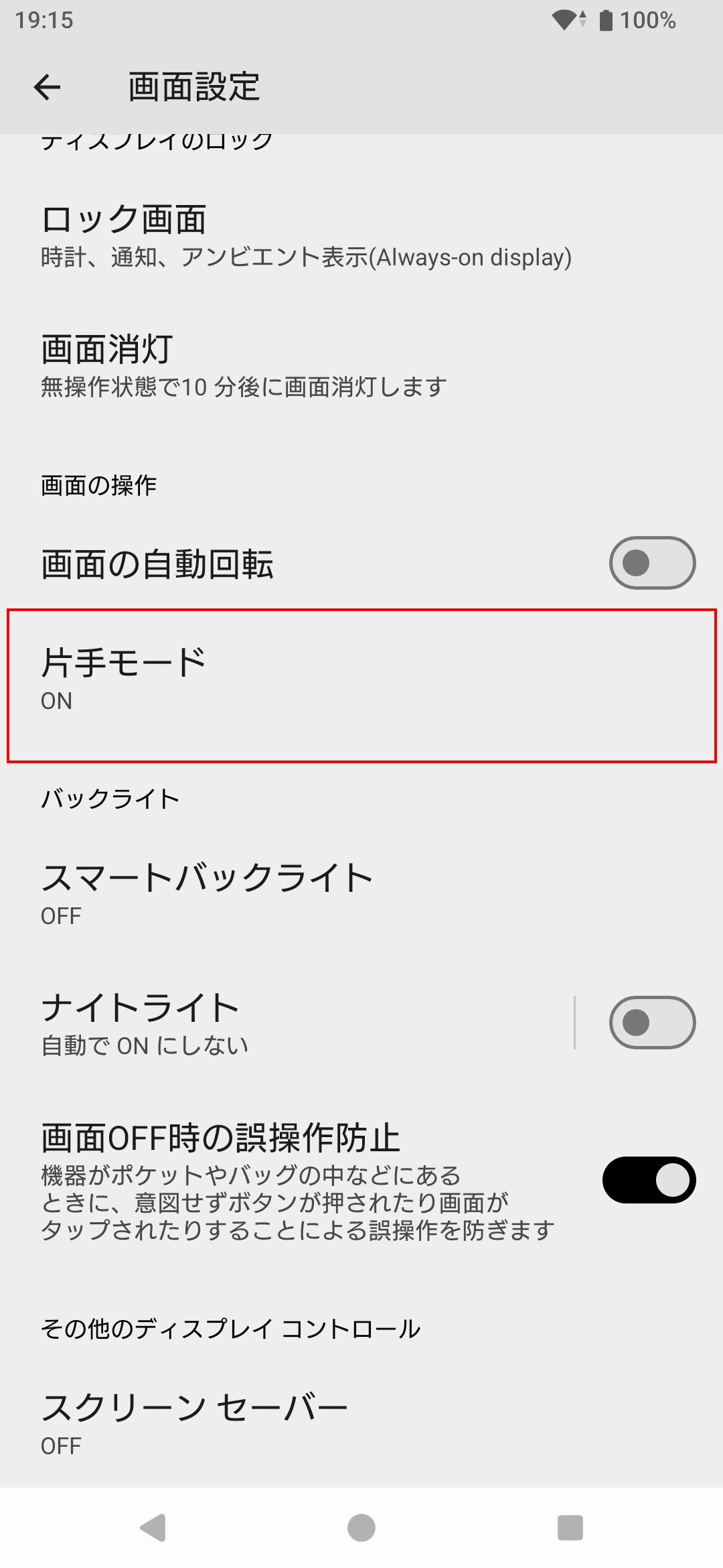[設定] > [画面設定] > [片手モード]の項目が削除