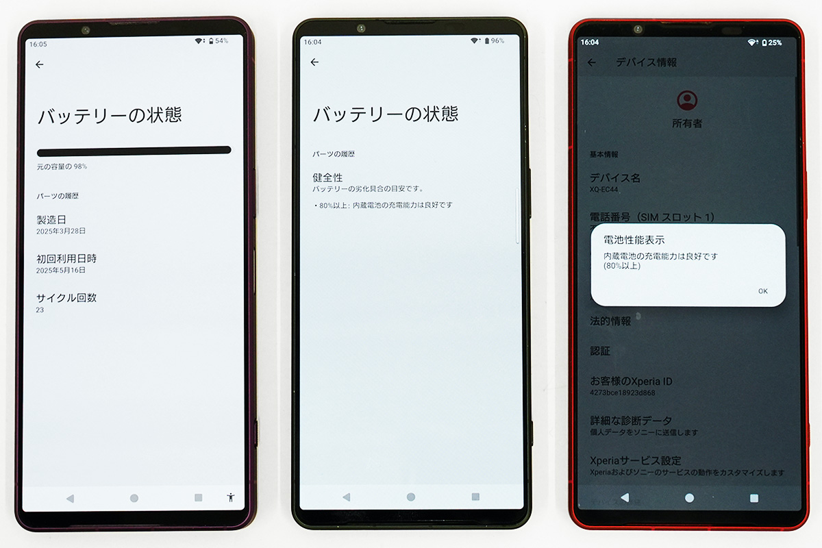 ※画像は、左からAndroid 16のXperia 1 VII、Xperia 1 VI、Android 15のXperia 1 VIのバッテリー情報。