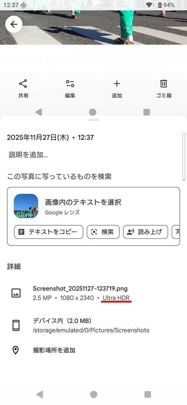 カメラアプリからUltra HDRで撮影した画像をスクリーンショットすると、そのスクショ画像もUltra HDRとして保存されていることが確認できる。