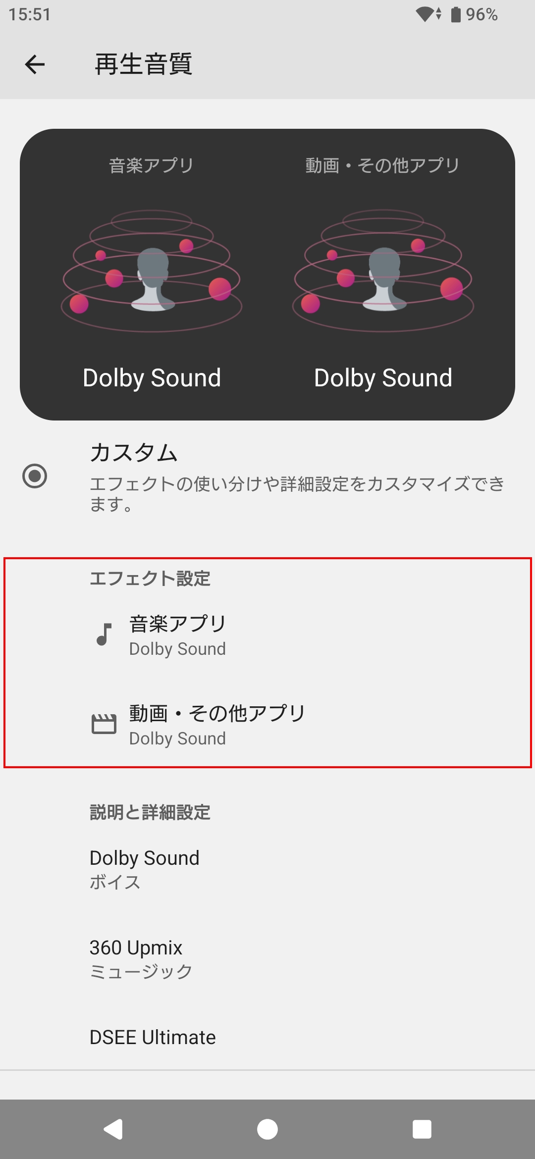 「音楽アプリ」、「動画・その他アプリ」ごとにエフェクト(Dolby Sound、360 Upmix、DSEE Ultimate)の詳細設定がカスタマイズできるようになる。