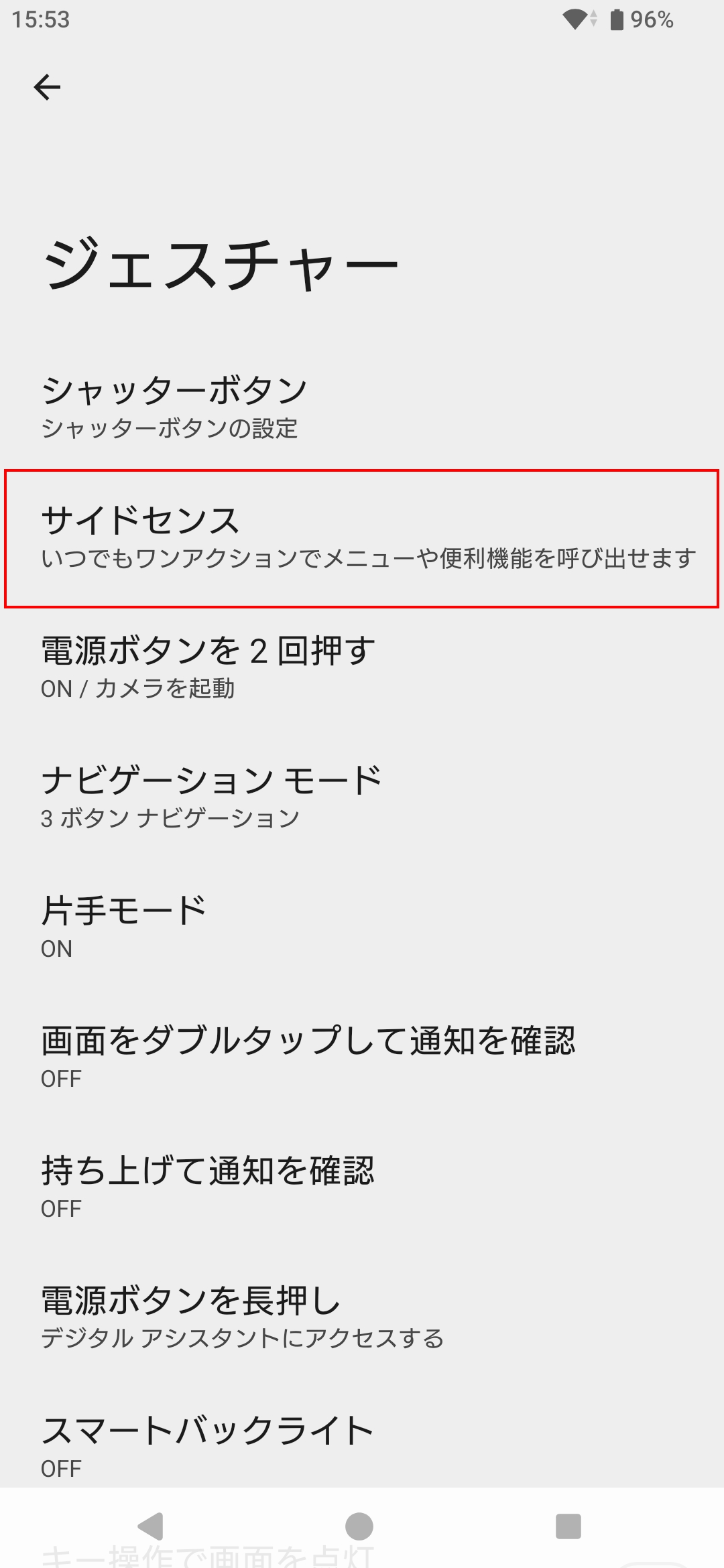 [サイドセンスバーを使用する]スイッチをタップして、機能をオン/オフする。