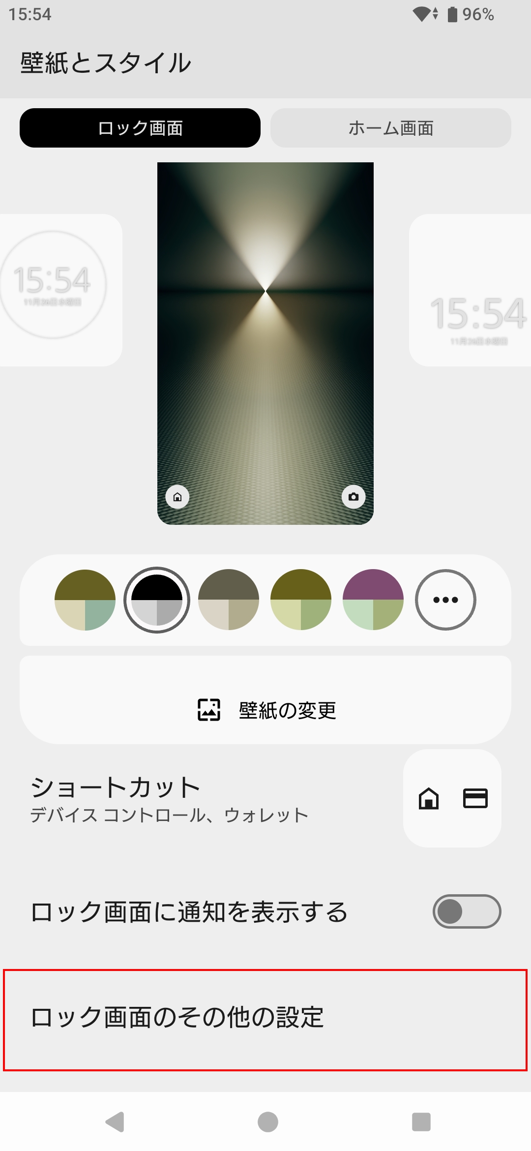 ホーム画面の何も表示されていないところを長押しして、[壁紙とスタイル] > [ロック画面] > [ロック画面のその他の設定]をタップする。