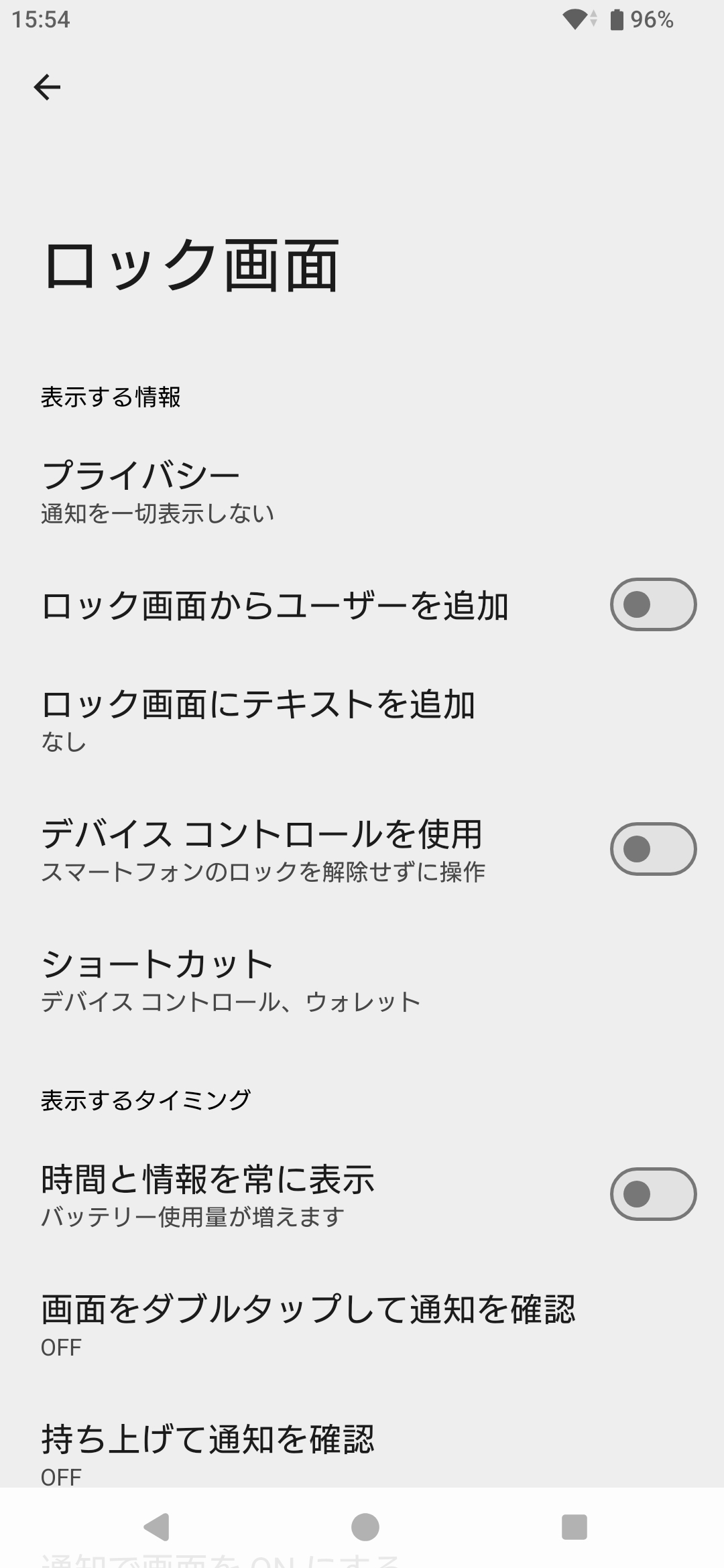 [タップしてロック画面を表示]スイッチは、[画面をダブルタップして通知を確認]の項目に変わっている。