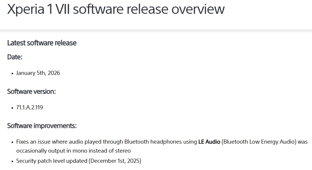 海外Xperia 1 VII に、LE Audio音声がモノラルになる不具合を改善する本体ソフトウェアアップデート配信。