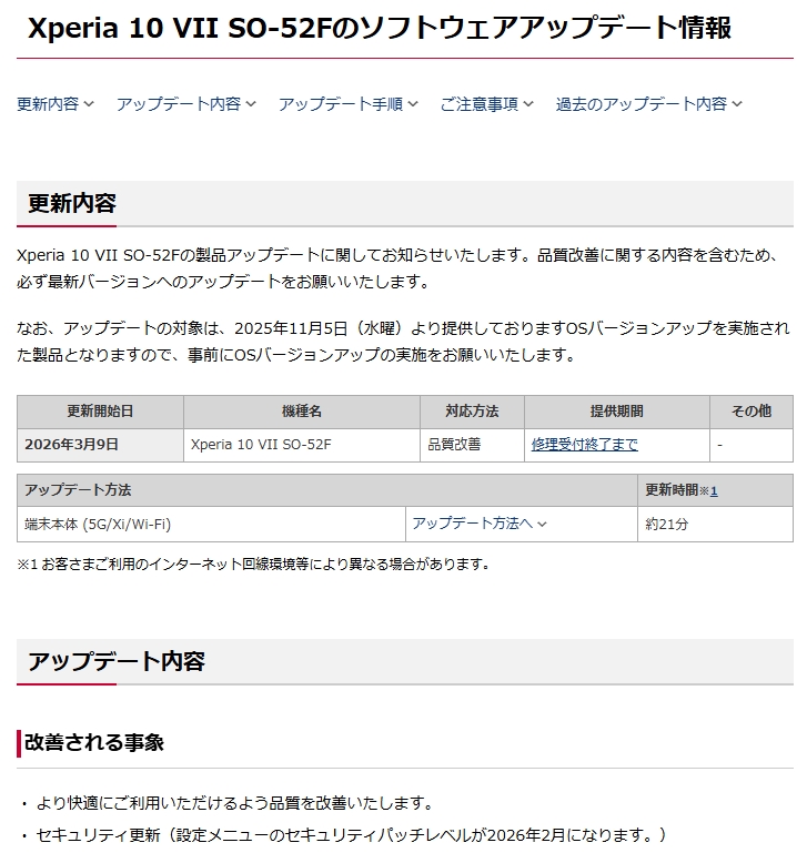 NTTドコモが販売されている「Xperia 1 VII」、「Xperia 10 VII」について、最新のアップデートが2026年3月9日より配信。