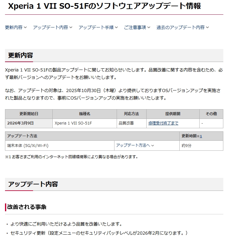 アップデート内容については、セキュリティパッチレベル2026年2月への更新、「より快適にご利用いただけるよう品質を改善」している。