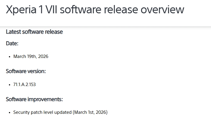 海外Xperia 1 VII に、本体ソフトウェアアップデート(71.1.A.2.154)配信。セキュリティパッチレベル2026年3月。