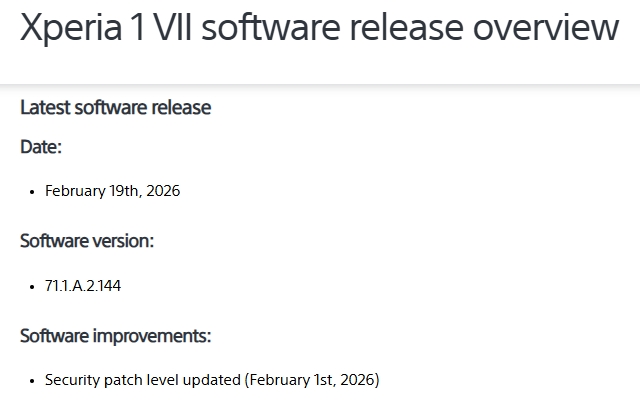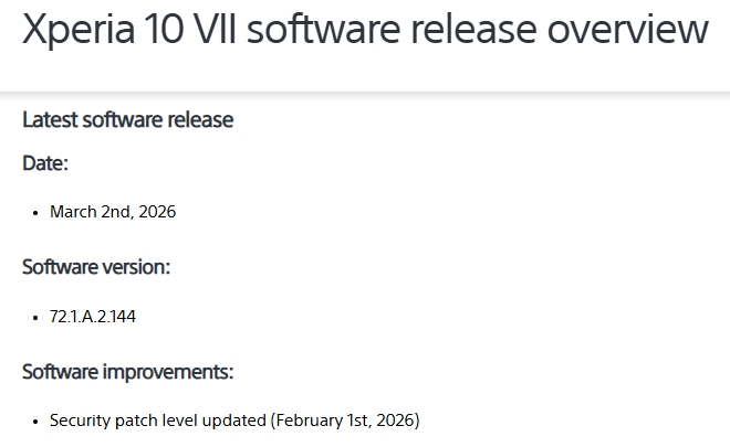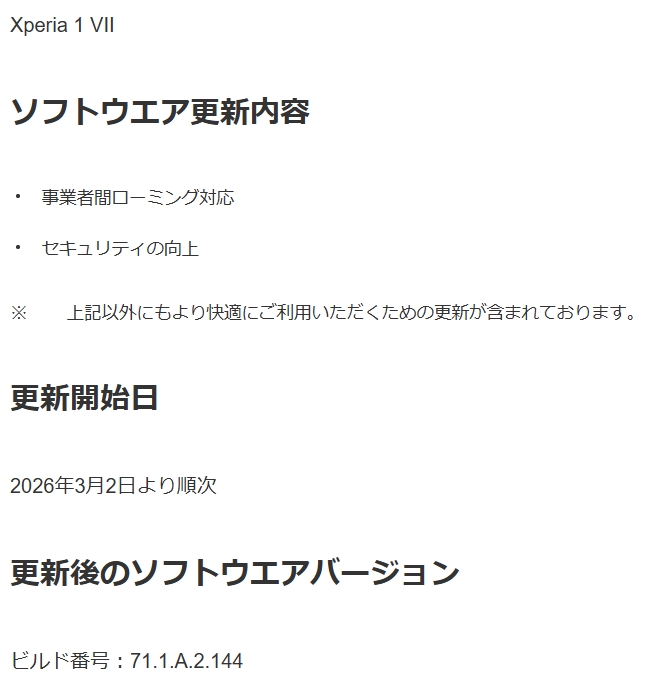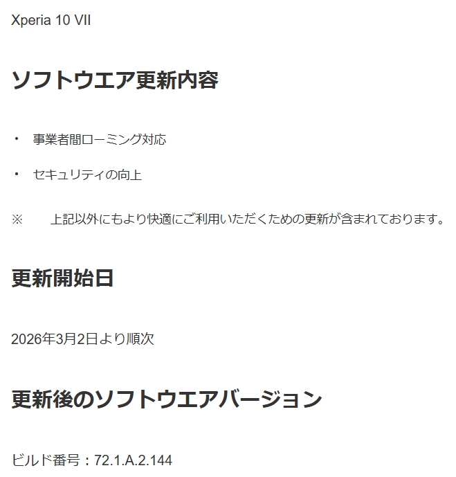 ソフトバンク・auが販売されているXperia 1 VII」、「Xperia 10 VIIについて、最新のアップデートが2026年3月2日より順次配信。