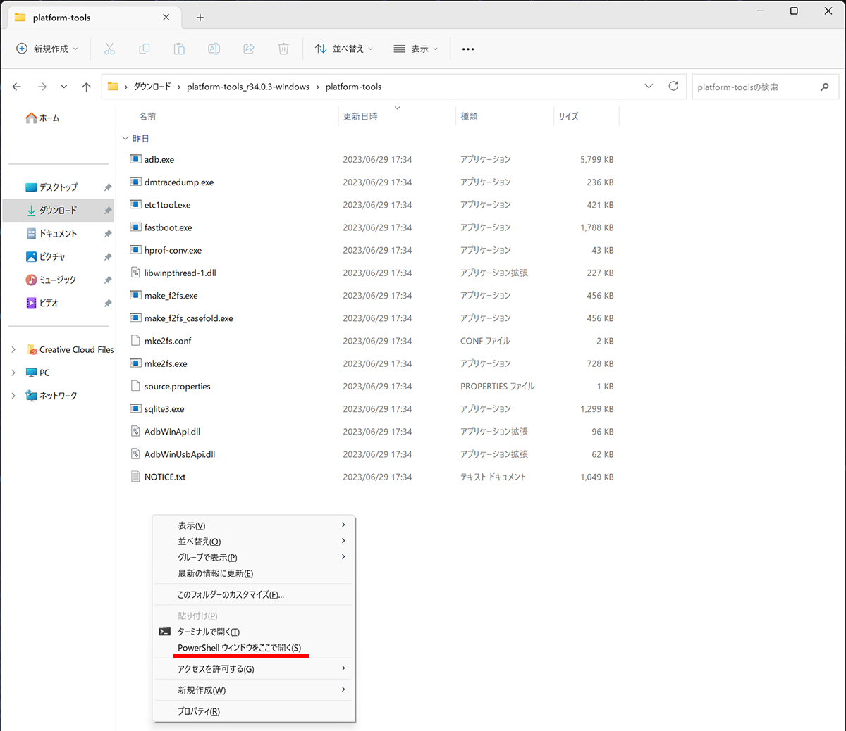 PC(Windows )に先程ダウンロードした「Platform-Tools」のフォルダを開く。(adb.exeがある事を確認。)