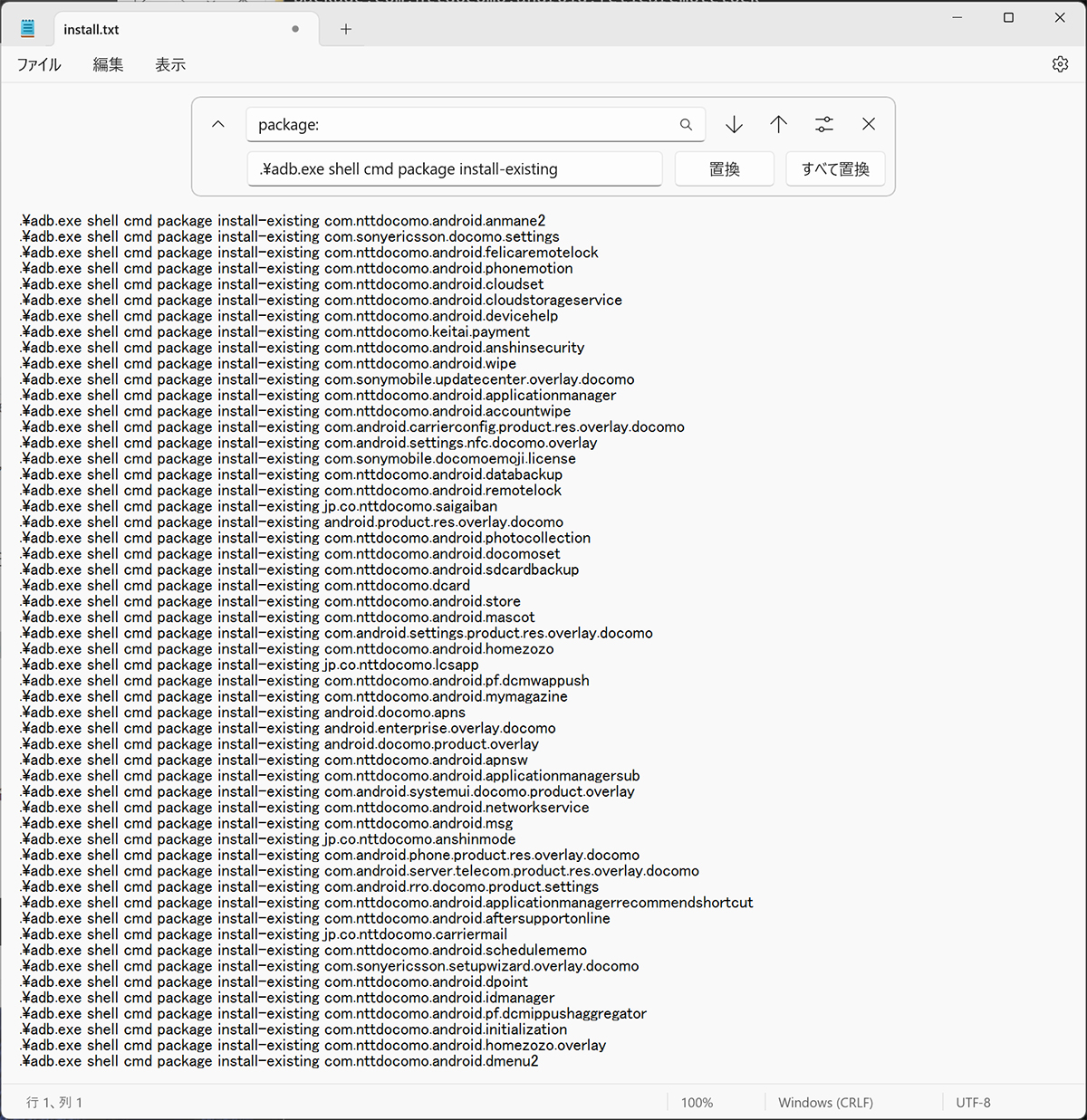 そして、さきほど抽出したドコモアプリのテキストデータをコピーして、テキストドキュメント( uninstall.txt )に貼り付ける。