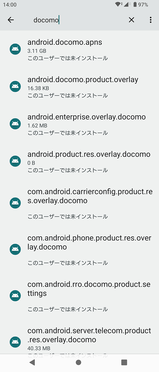 そこで、ドコモのアプリには、パッケージ名に”docomo”という文字列が含まれることがわかっているので、コレを利用するのがてっとり早い。