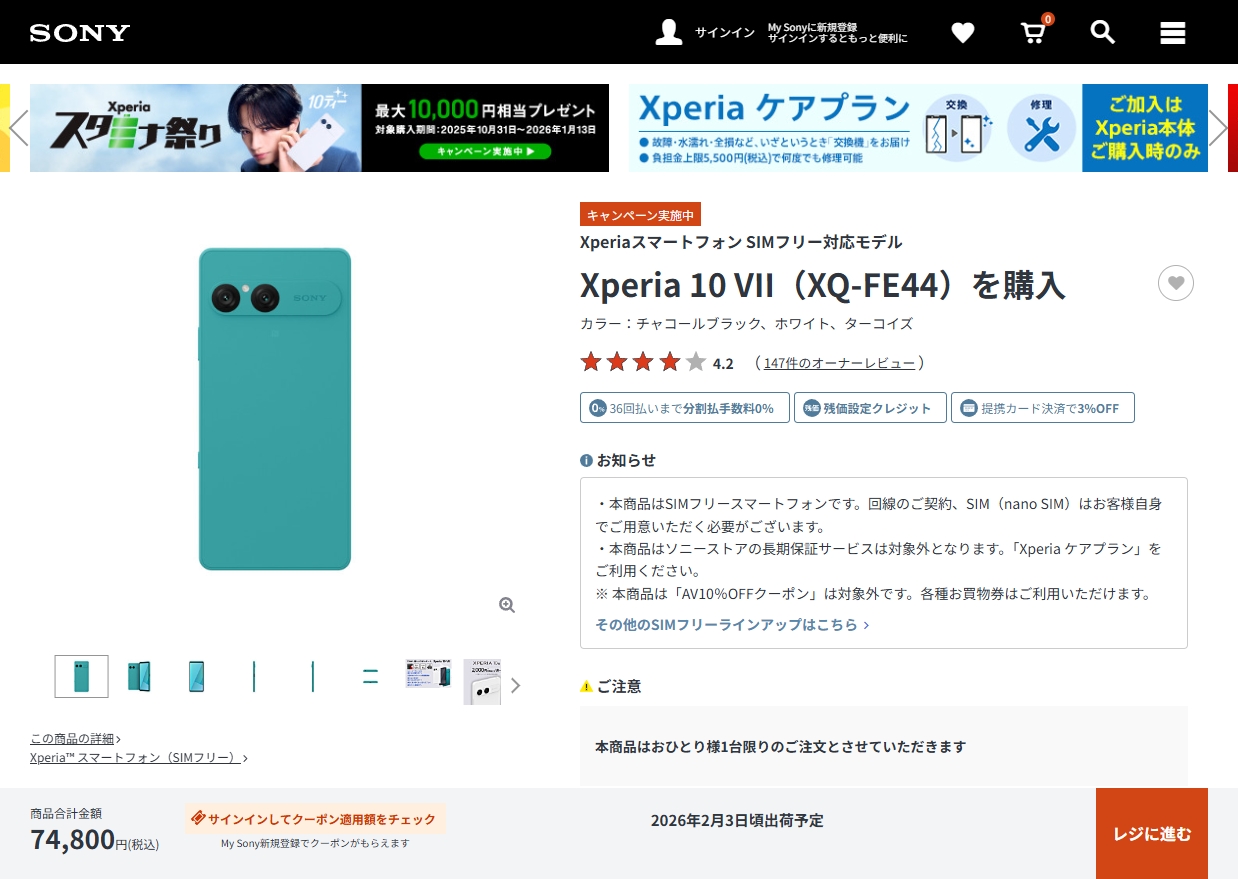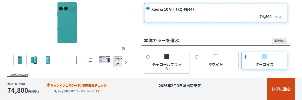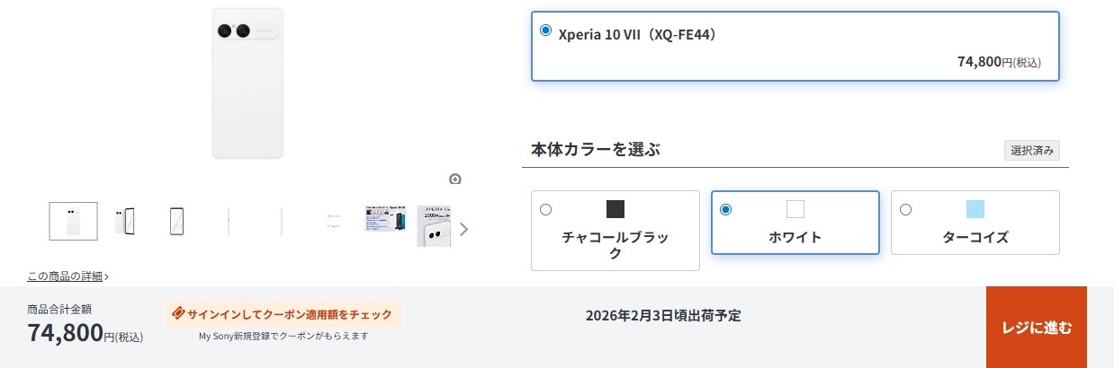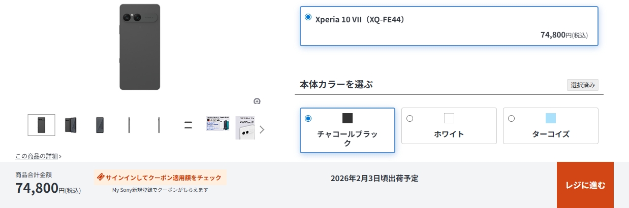 Xperia 10 VII(XQ-FE44)については、チャコールブラックホワイトが現在の納期が全モデル2026年2月3日頃出荷予定