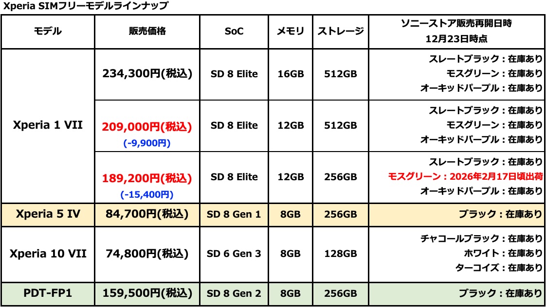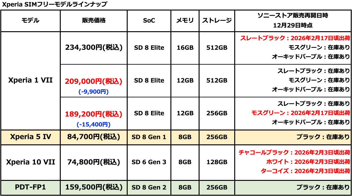 Xperia 1 VII の一部モデルと、Xperia 10 VII の納期が2026年2月出荷に。SIMフリーモデル Xperia ソニーストア納期情報(2025年12月29日)