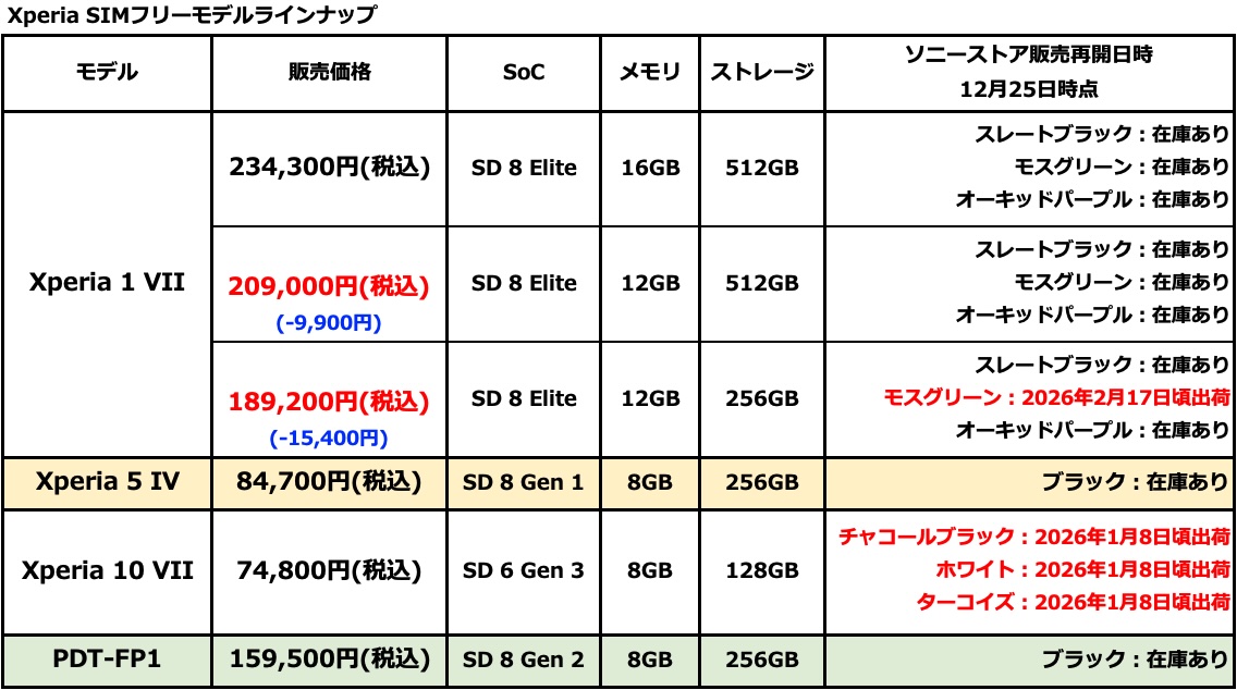 ソニーストアで販売されているXperiaラインナップの中で、 Xperia 1 VII(XQ-FS44)Xperia 10 VII(XQ-FE44)について、年末となり納期の変化が起きている。