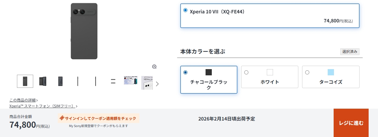 Xperia 10 VII(XQ-FE44)については、チャコールブラックとホワイトが納期が延びて2026年2月14日頃出荷予定