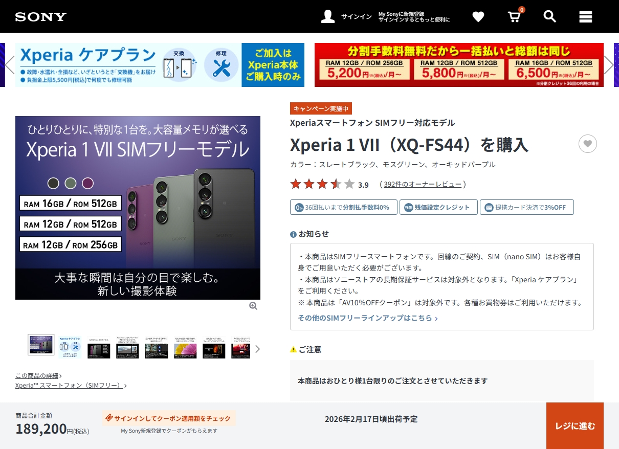 Xperia 1 VII(XQ-FS44) ソニーストア在庫状況(1月17日時点)