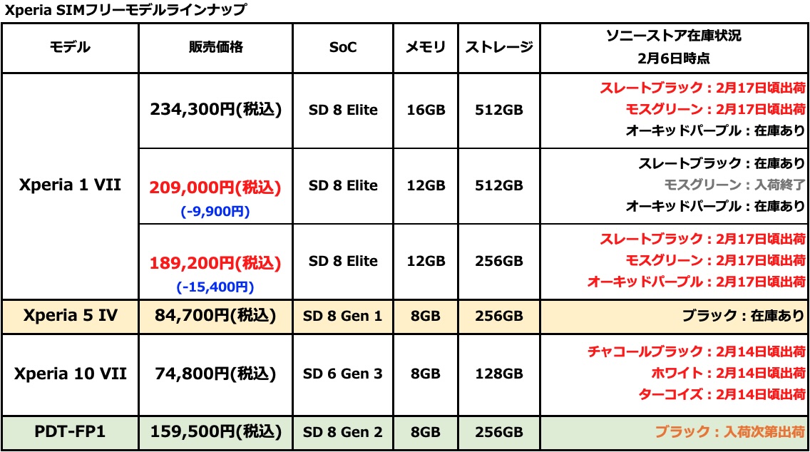 Xperia 1 VII(XQ-FS44) ソニーストア在庫状況(2月6日時点)