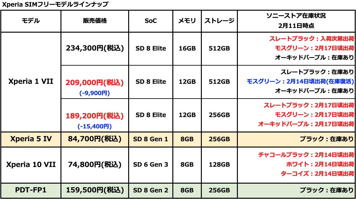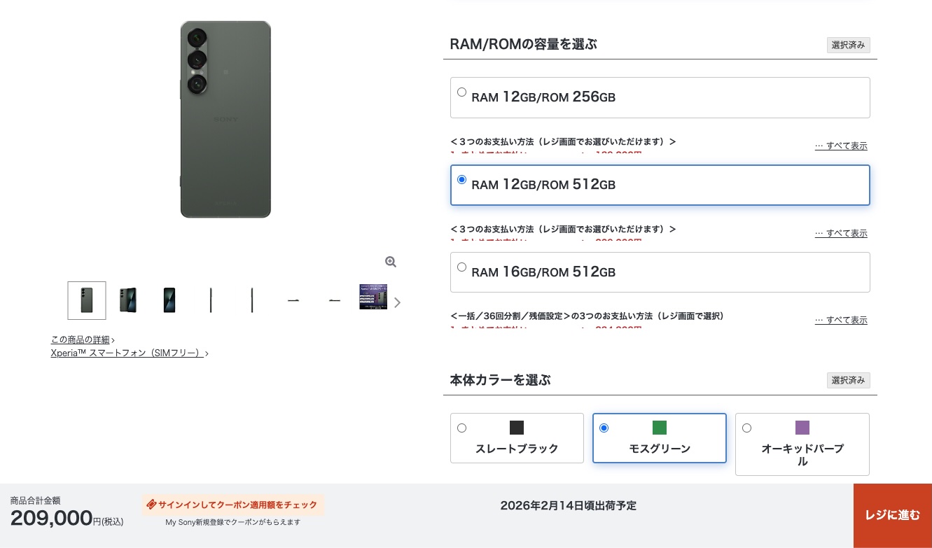 Xperia 1 VII (XQ-FS44) ストレージ増量版RAM 12GB/ROM 512GB”モスグリーン”が、ソニーストアで少数?の在庫復活!Xperia 10 VII と同日出荷 SIMフリーモデル 納期情報(2026年2月11日)。