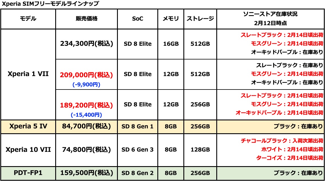 Xperia SIMフリーモデル ソニーストア前倒し出荷!Xperia 1 VII / Xperia 10 VII 納期はほぼ改善 (2026年2月13日)。