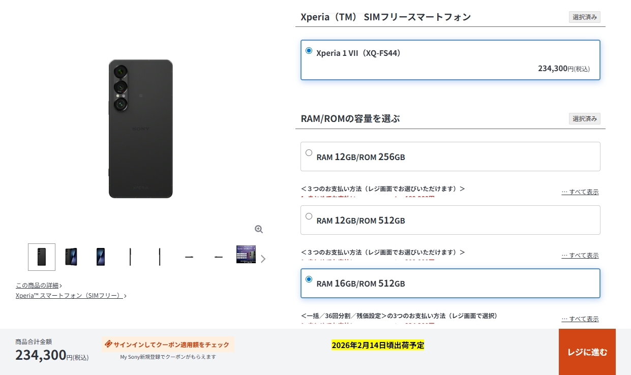 出荷予定日は2026年2月14日頃となっており、Xperia 10 VIIも含めてひさしぶりに納期状況が改善し、今から購入すればすぐに手に入る状態となっている。