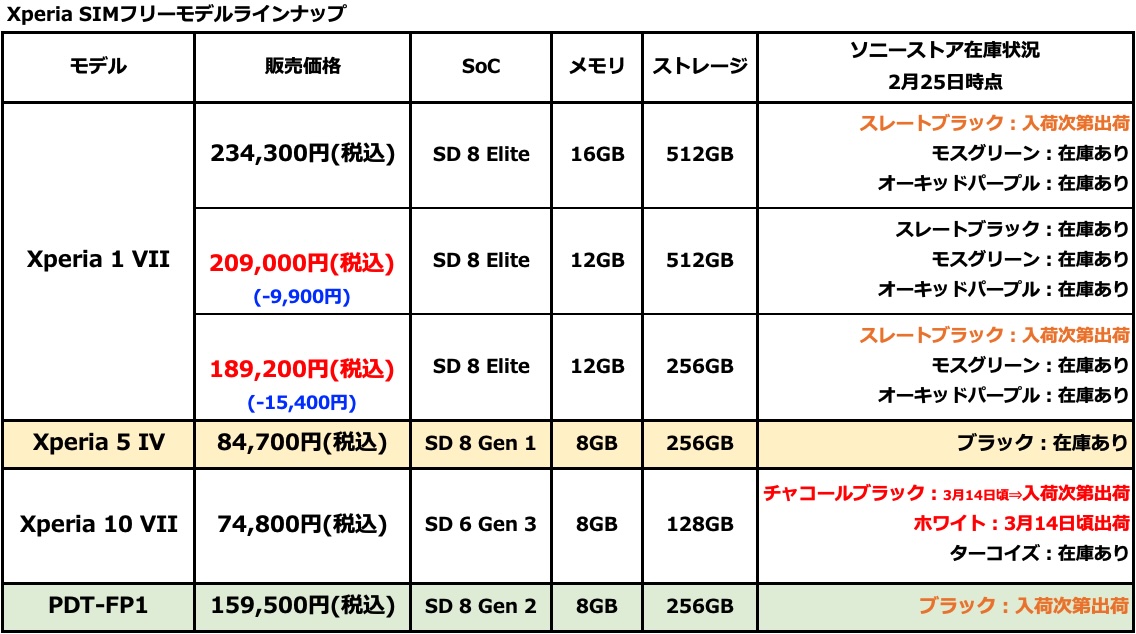 Xperia 10 VIIの在庫が枯渇!?Xperia 1 VII 他 SIMフリーモデルソニーストア納期情報 (2026年2月25日)。