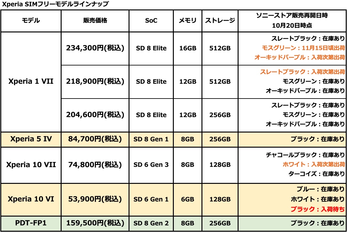 Xperia 1 VII(XQ-FS44) ソニーストア在庫状況(10月20日時点)